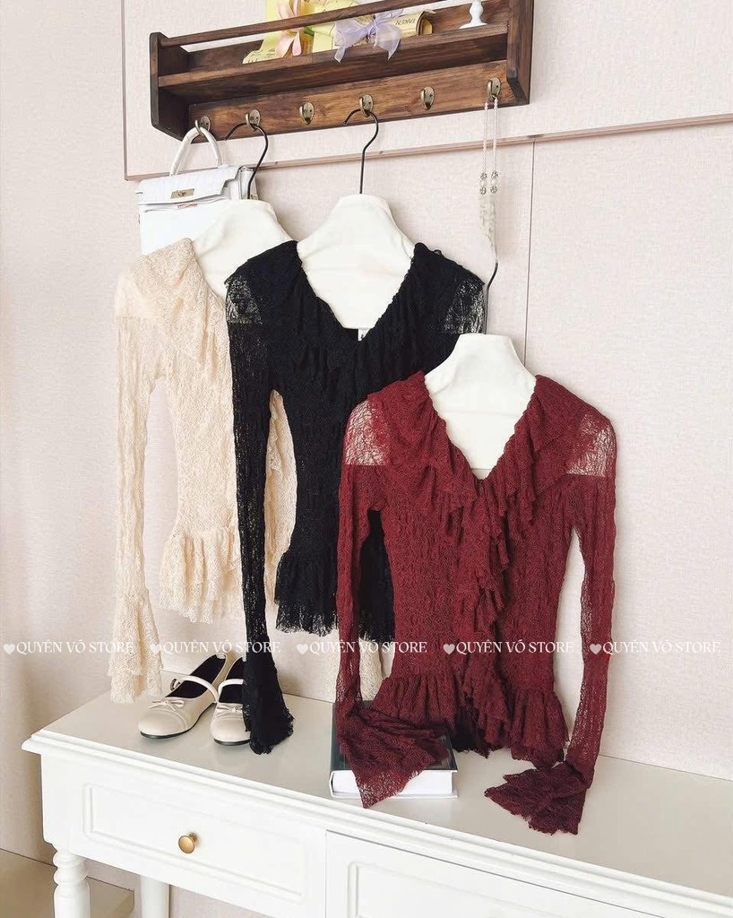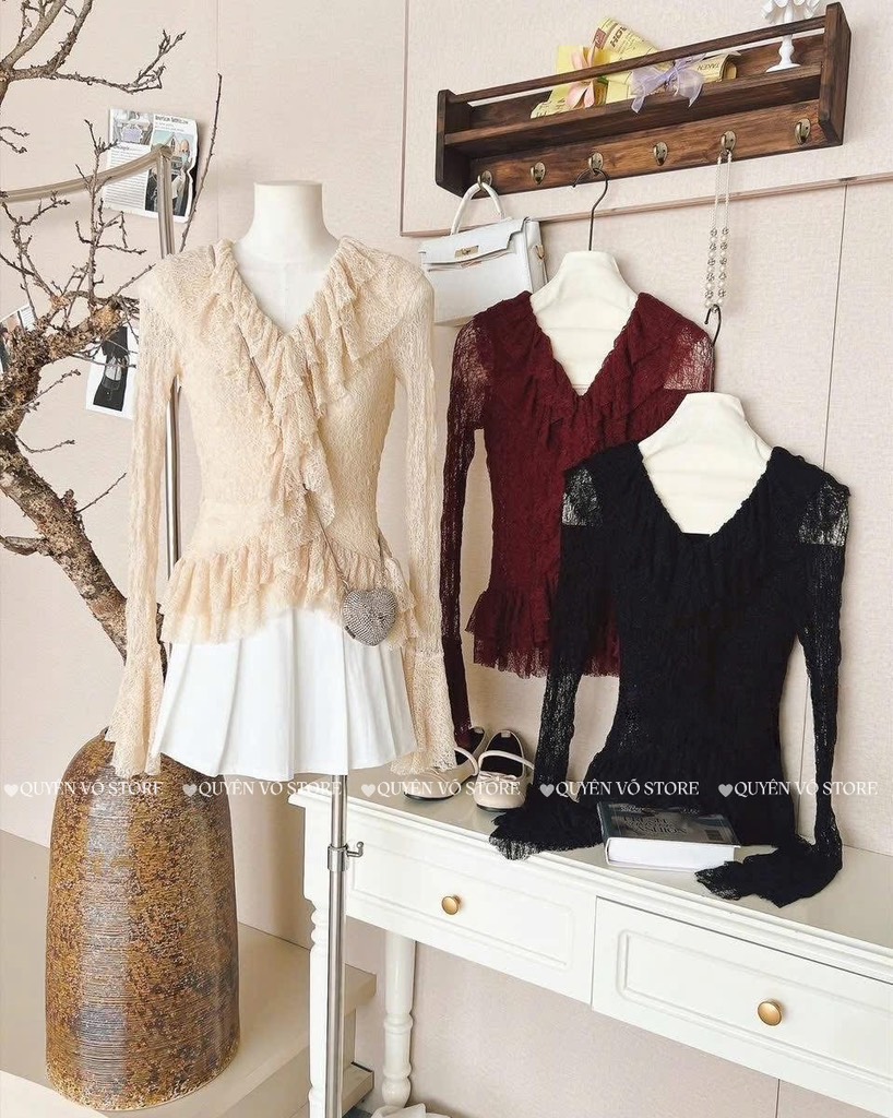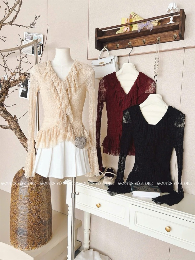 Set áo đỏ cổ V bèo nhíu x chân váy bi đen