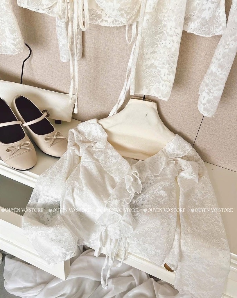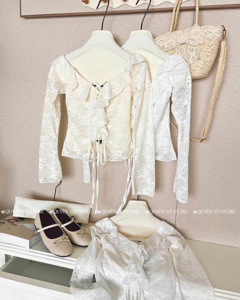 Set áo đỏ cổ V bèo nhíu x chân váy bi đen