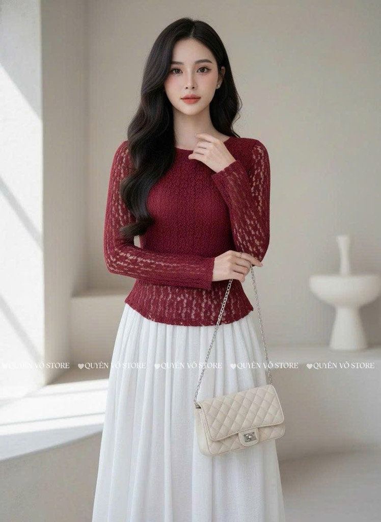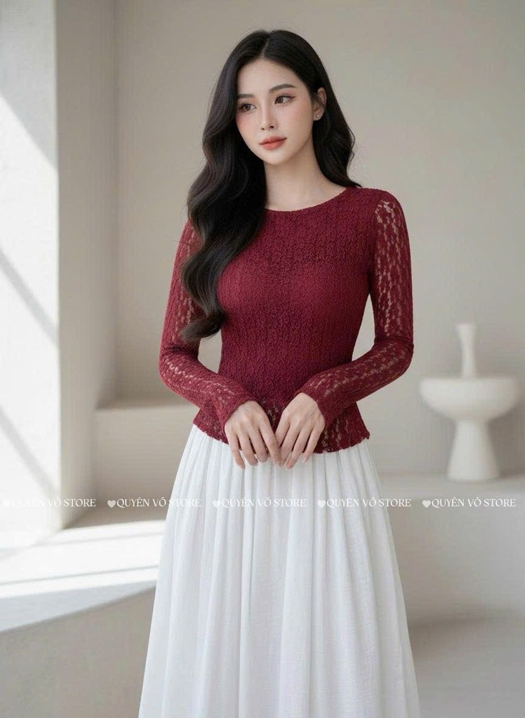 Áo ren ôm body cổ tròn tay dài - Đỏ 1505
