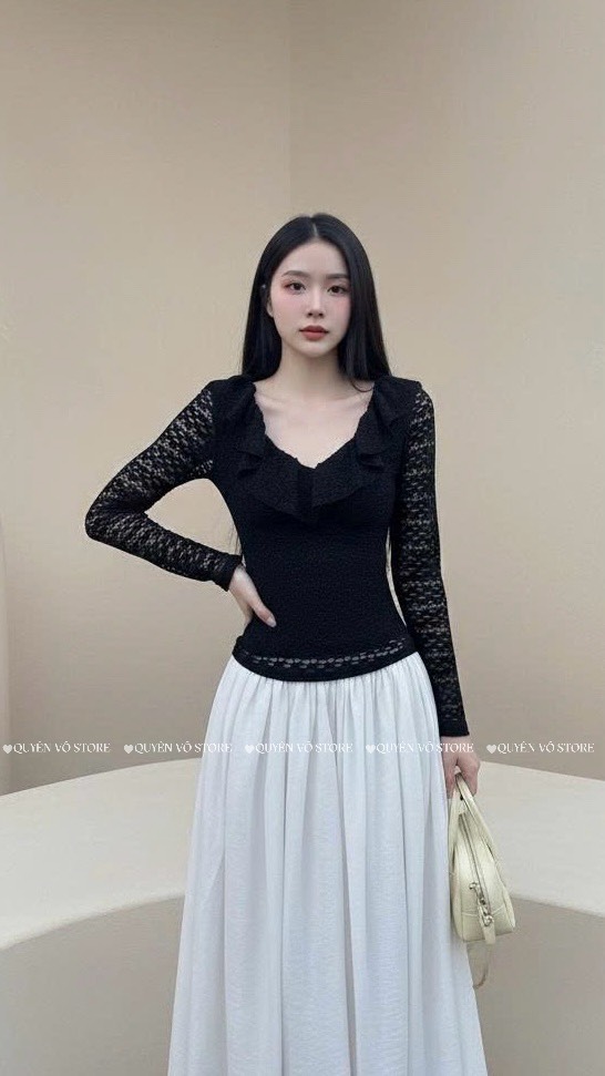 Set áo đỏ cổ V bèo nhíu x chân váy bi đen