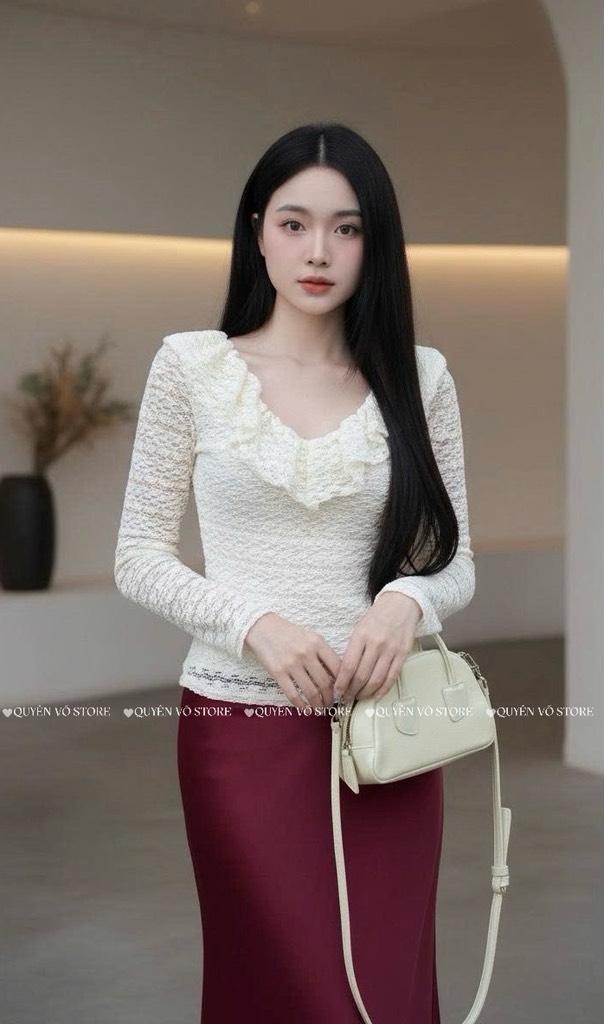 Áo ren ôm body cổ V bèo - Kem 1511