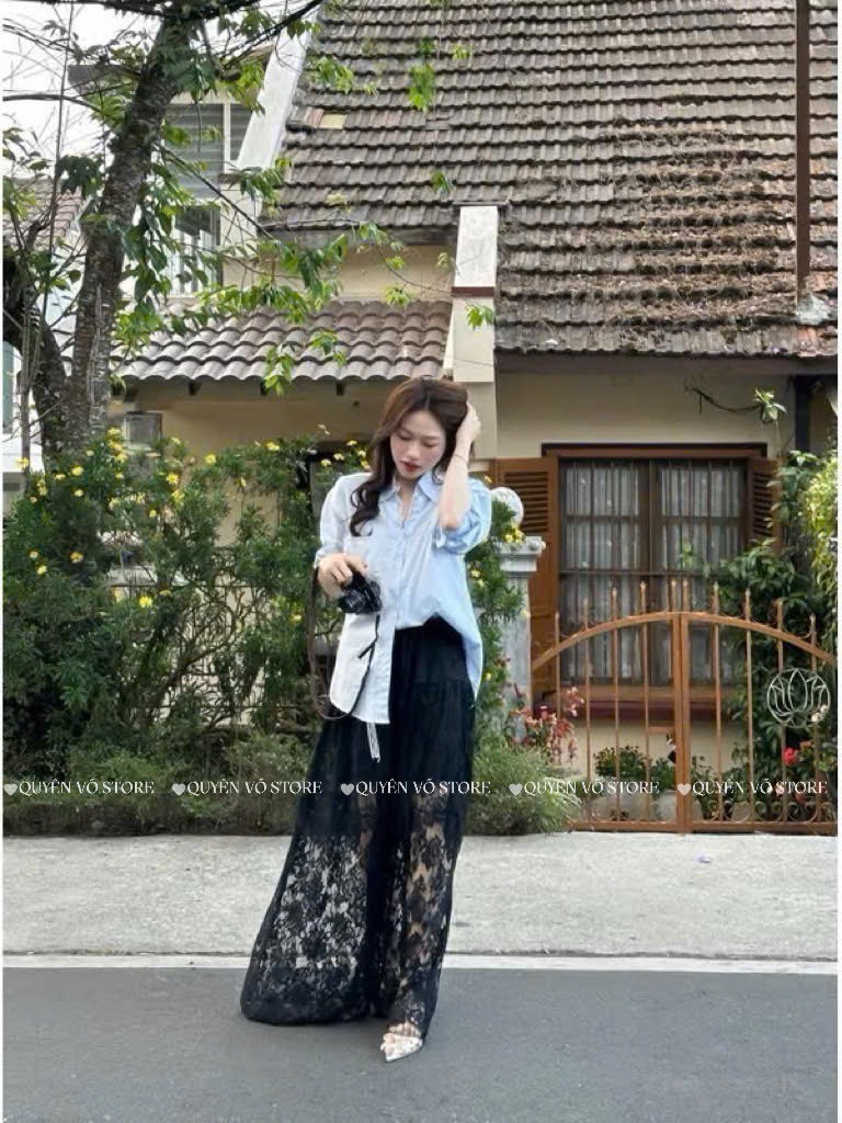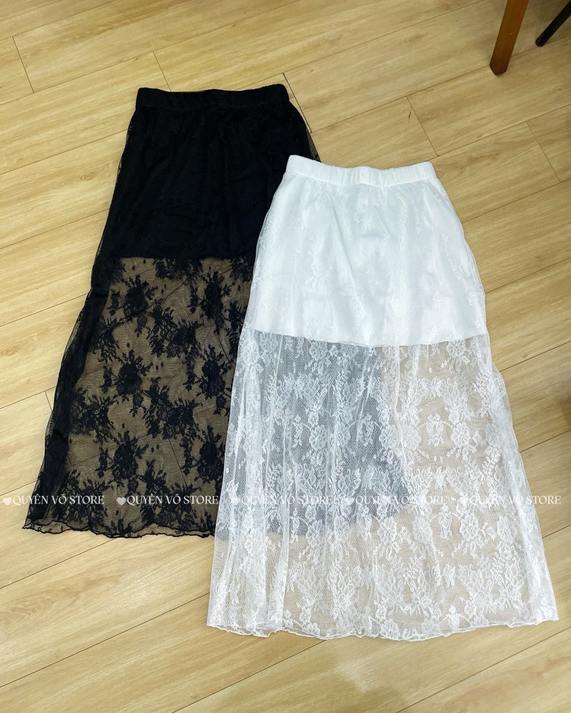 Chân váy ren xòe A dáng dài - Đen