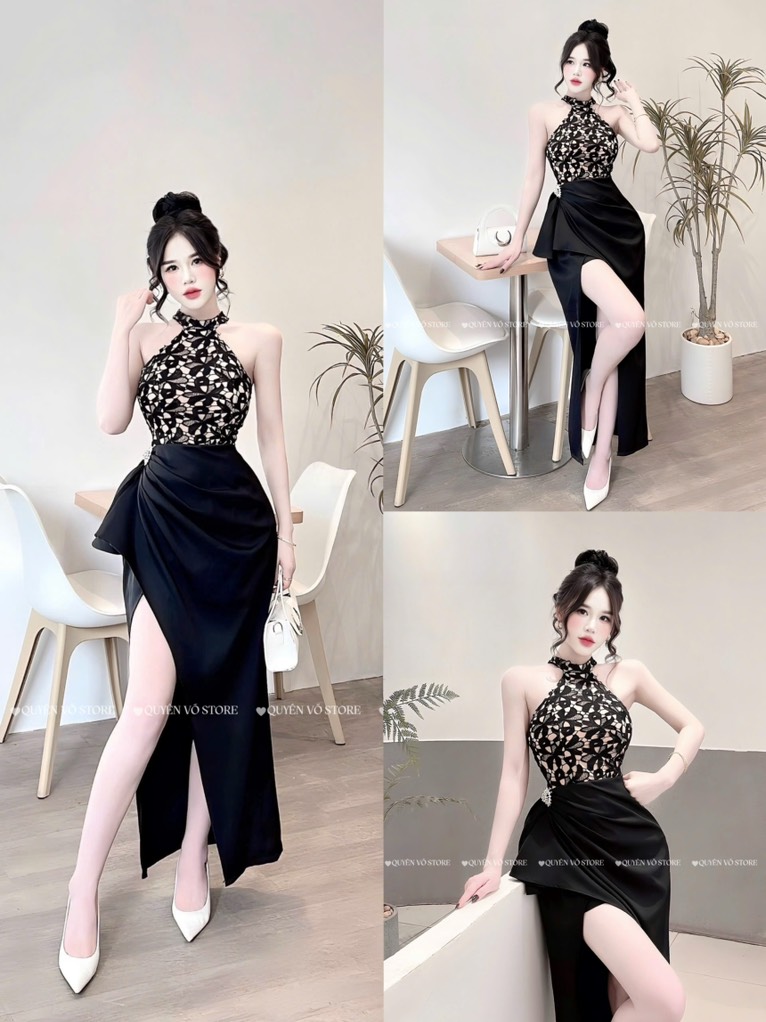 Đầm cổ yếm ren phối lụa ôm body - Đen