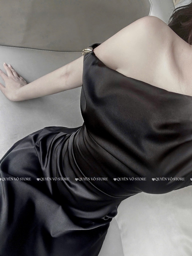 Đầm lụa lệch vai xếp ly eo - Đen