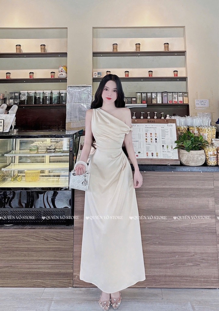 Đầm lụa lệch vai xếp ly eo - Kem