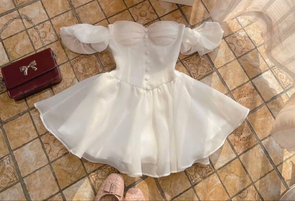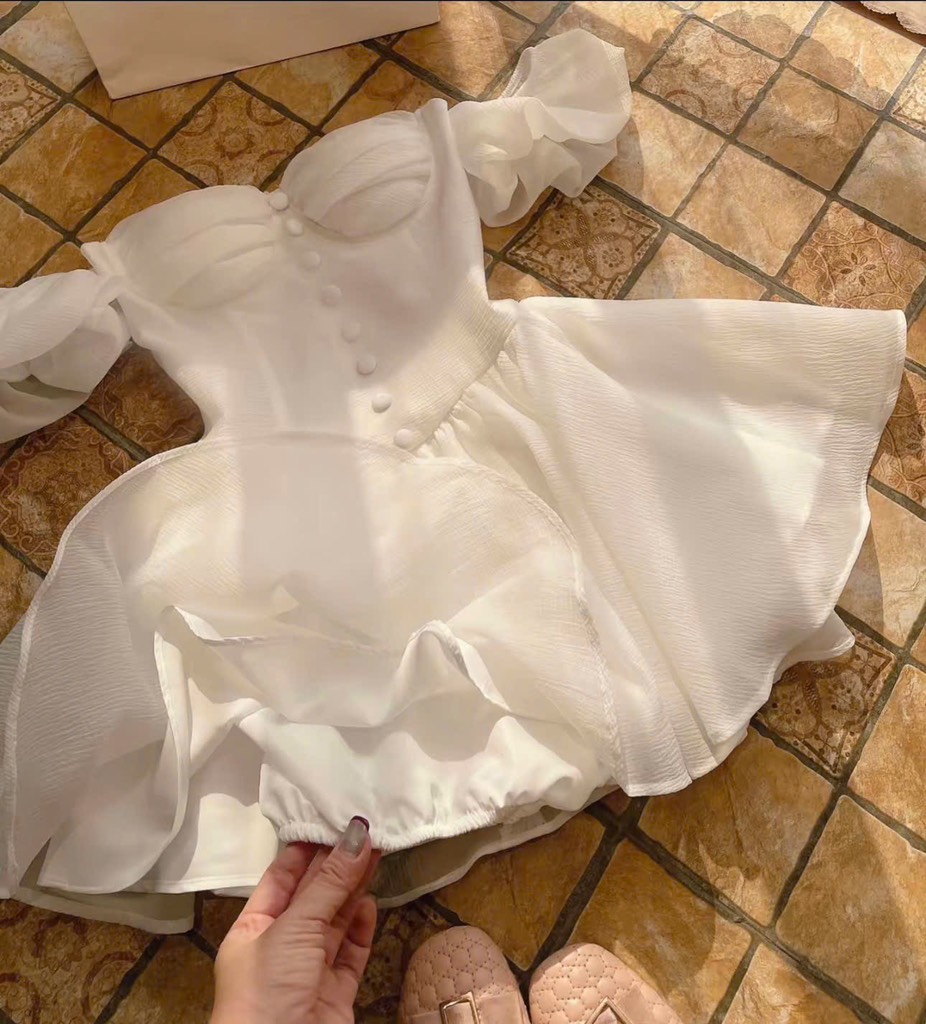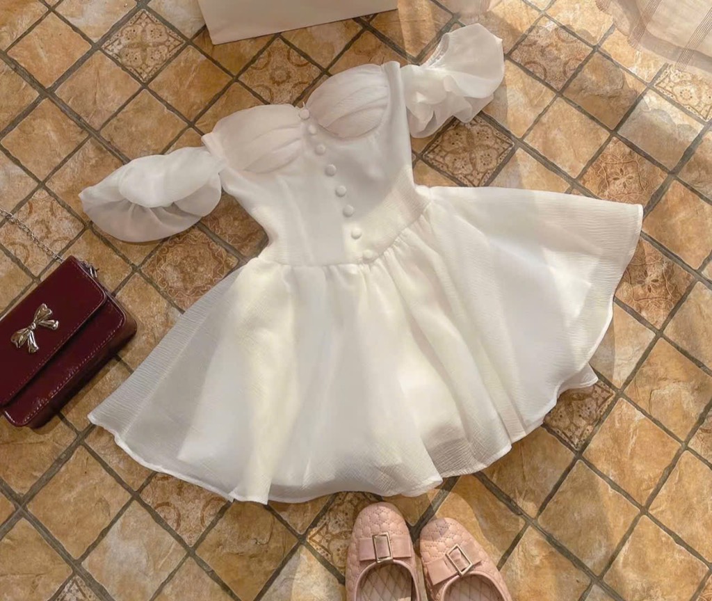 Đầm trắng cúp ngực có mút nút bọc