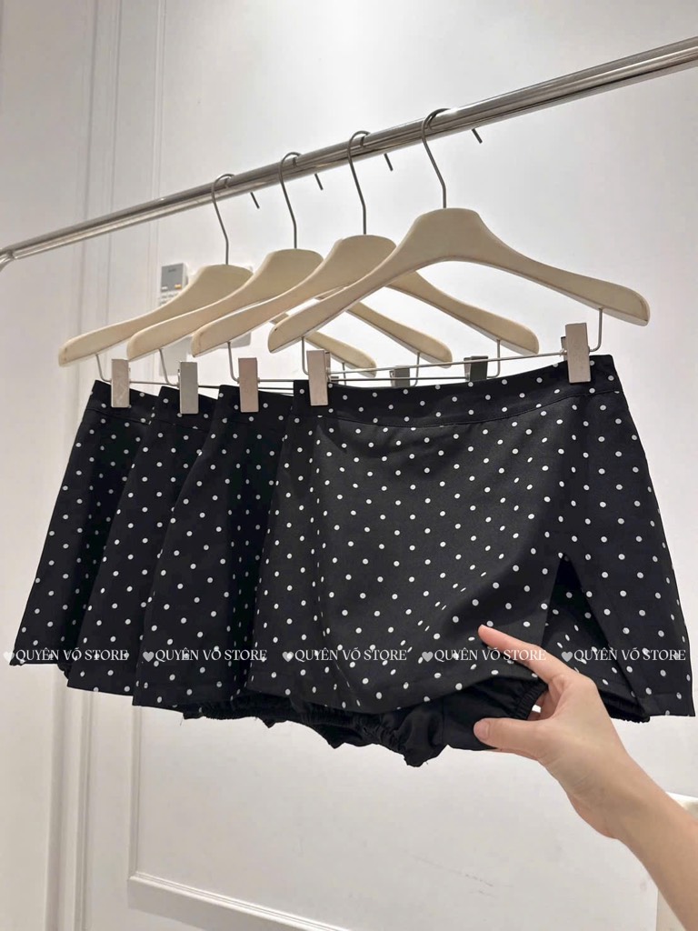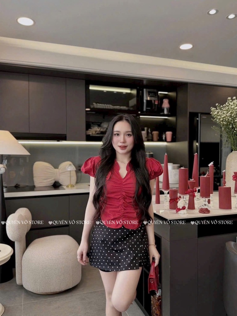 Set áo đỏ cổ V bèo nhíu x chân váy bi đen