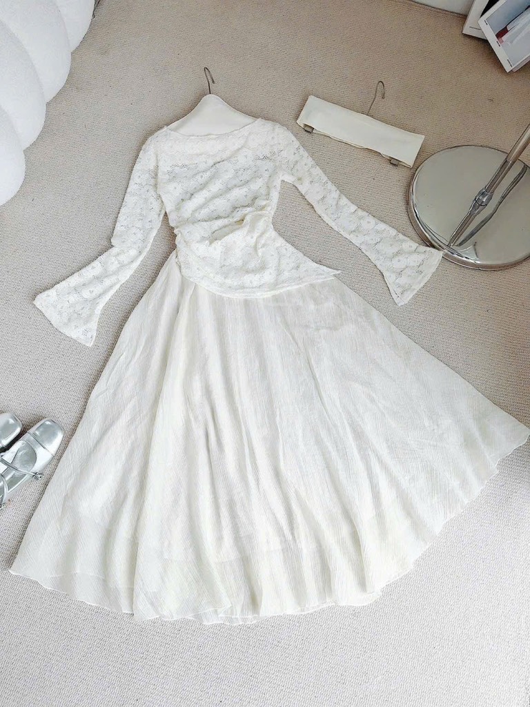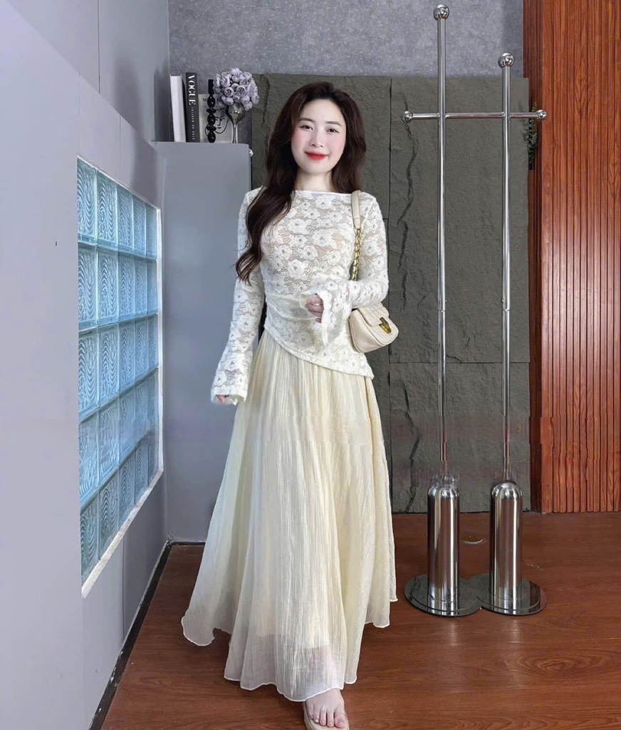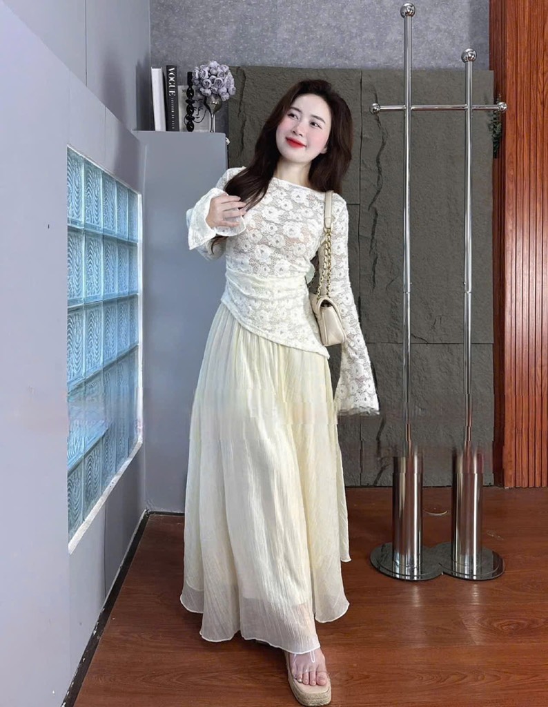 Set áo ren tay dài tà chéo chân váy tơ