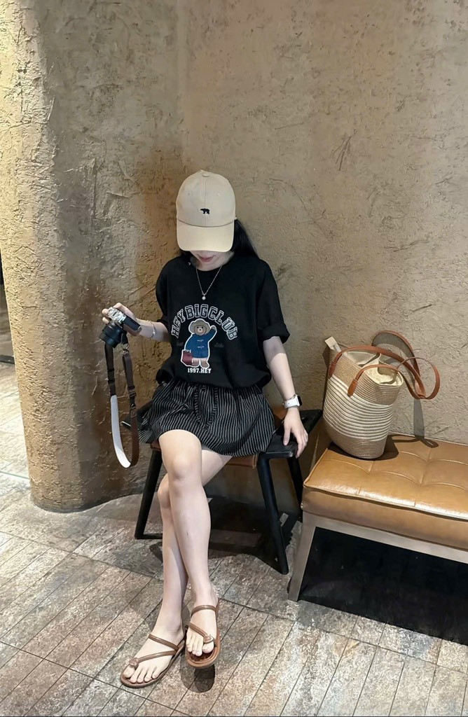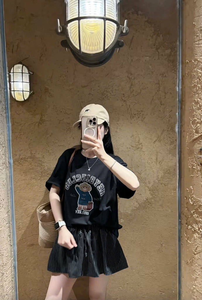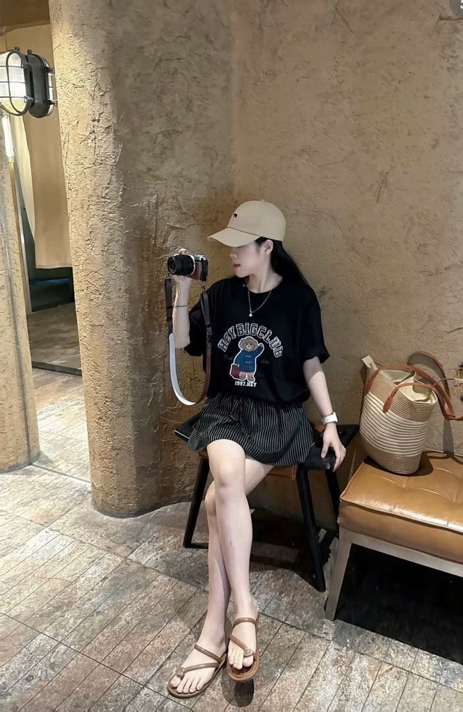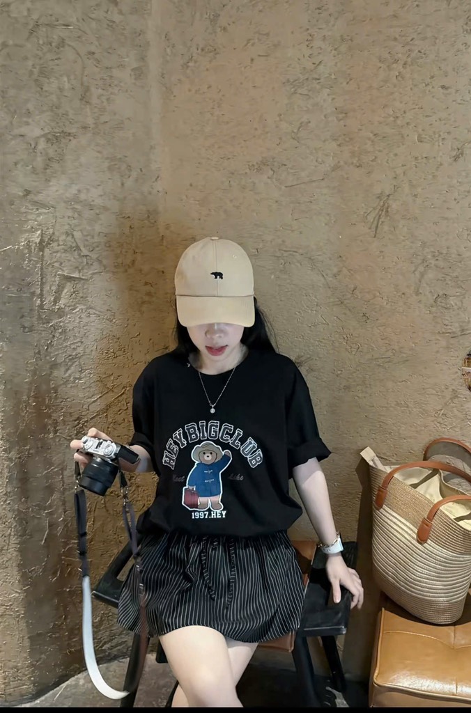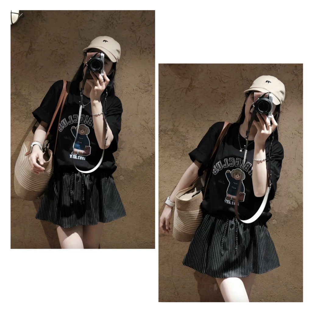Set áo thun đen gấu chân váy sọc