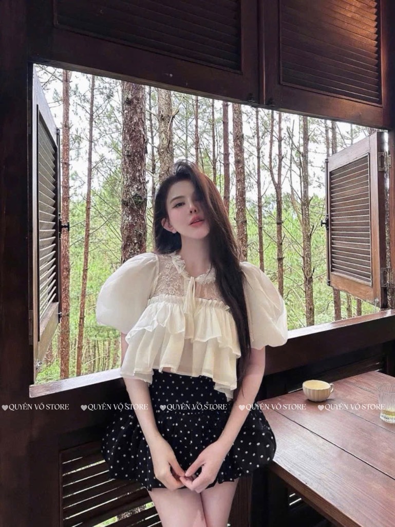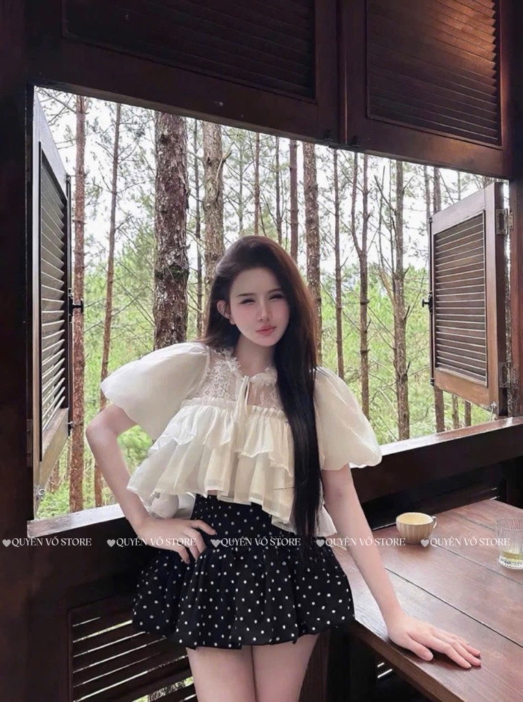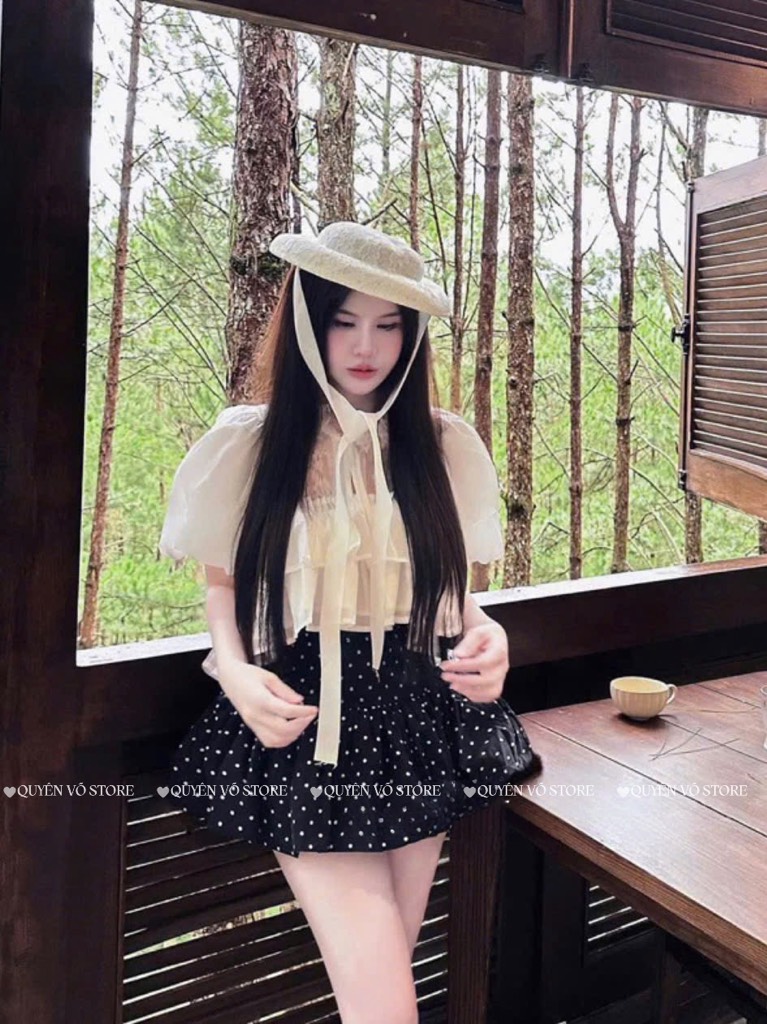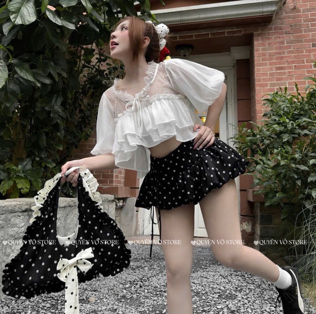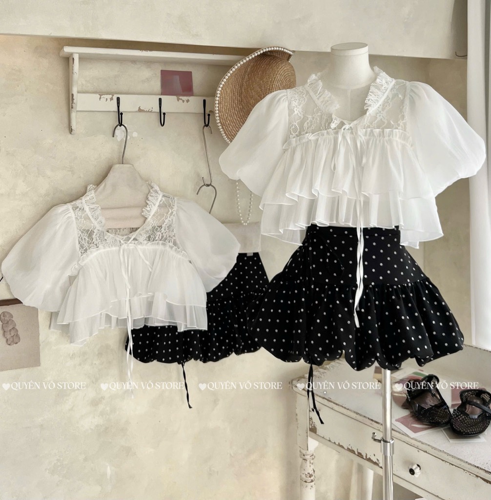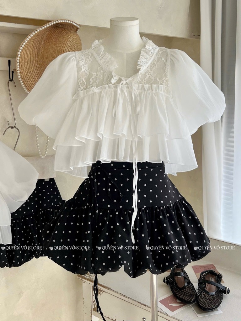 Set áo tơ ren chân váy chấm bi - 1058