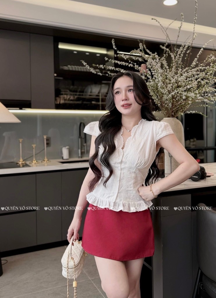 Set áo đỏ cổ V bèo nhíu x chân váy bi đen