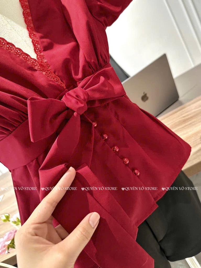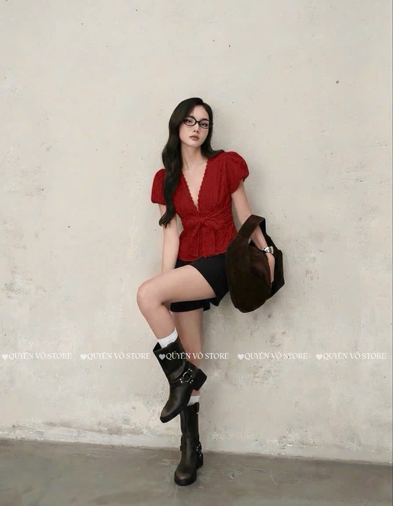 Set đỏ cổ V nơ ngực x short đen